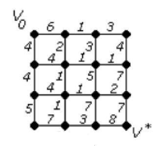 За допомогою алгоритму Дейкстрі, в графі зображеному на рисунку, знайти довжину найкоротшого шляху від вершини V0 до вершини V*.