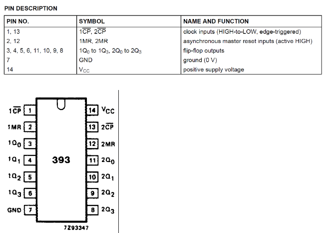 The 74HC/HCT393 are 4-bit binary ripple counters with separate clocks (1CP and 2 CP) and master reset (1MR and 2MR) inputs to each counter. The operation of each half of the "393" is the same as the "93" except no externalclock connections are required.The counters are triggered by a HIGH-to-LOW transition of the clock inputs. The counter outputs are internally connected to provide clock inputs to succeeding stages.