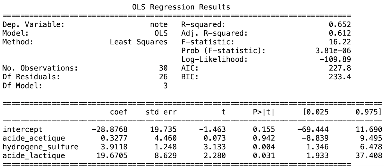 statsmodels.api.OLS permet d'obtenir les résultats suivants :