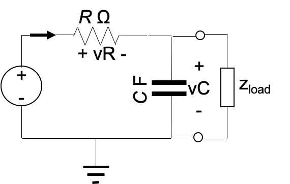 For the circuit shown below, where R = 7.2 kΩ, and C = 9.5 μF, and the source is sinusoidal with an angular frequency (ω) of 1 k rad/s: