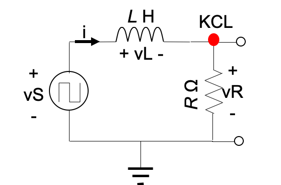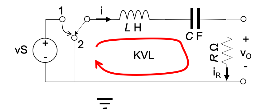 Write out the KVL indicated in this circuit, in terms of the current (i), source voltage (vS), R, C and L, for t > 0.