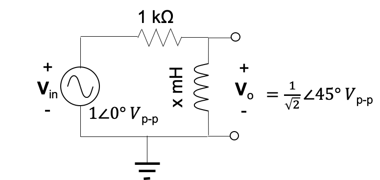 For the circuit shown below, which is driven by a sinusoidal voltage source with an amplitude of 1V at 0 degrees phase, where x = 1.5 ...
