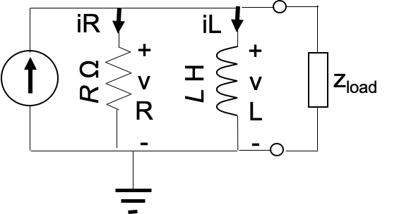 For the circuit shown below, where R = 5.3 kΩ, and L = 41.9 mH, and the source is sinusoidal with an angular frequency (ω) of 1 k rad/s: