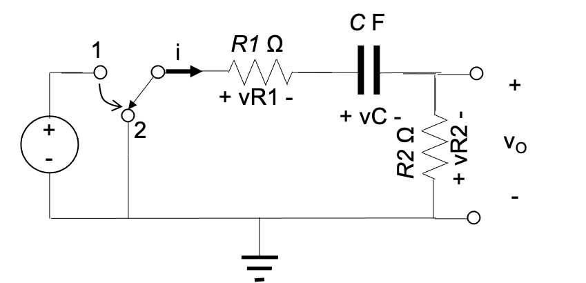 For the circuit shown below, the switch moves from 1 to 2 at t=0. What is the initial voltage (in V) over the capacitor?Answer to within 1% accuracy.