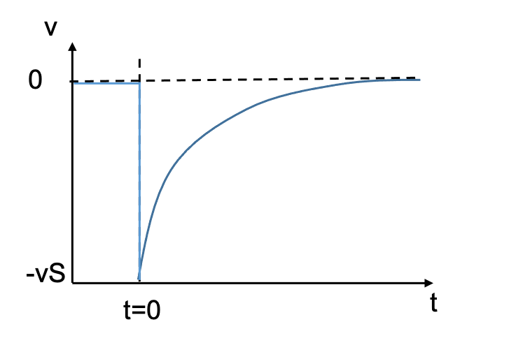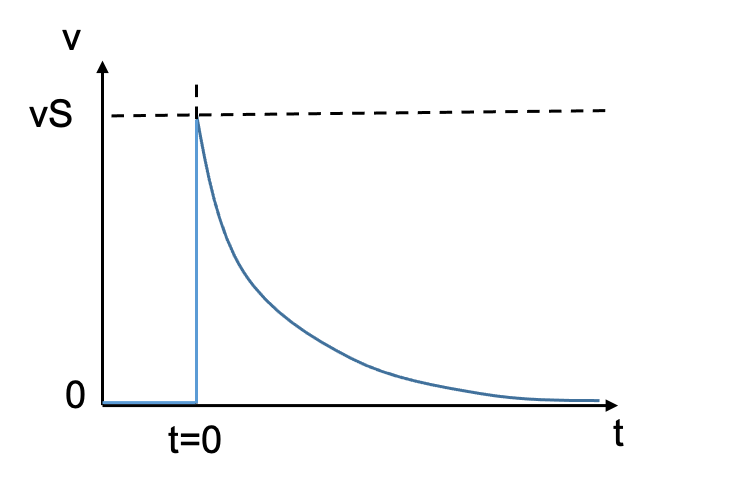 For the circuit shown below, the switch moves from 1 to 2 at t=0. Which of the following plots is a good representation of the voltage over the inductor?