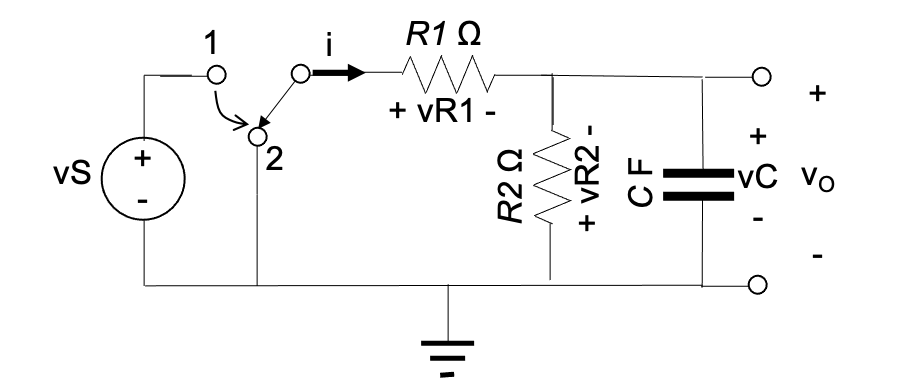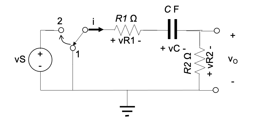 vS = 7 V, R1 = 7.9 kΩ, R2 = 3.6 kΩ, C = {C} μF.