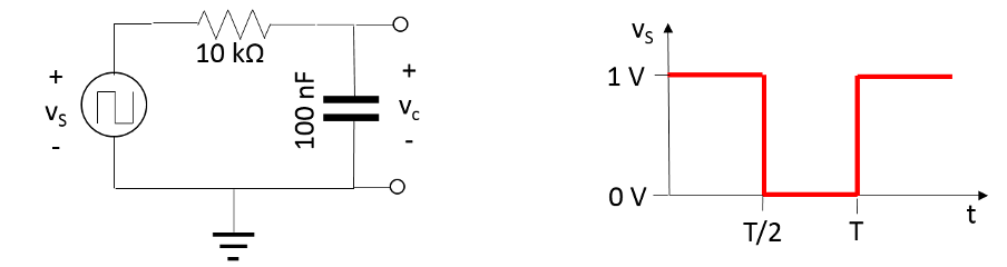Given the RC circuit below, where the voltage source is providing a square wave with a low level of 0 V and a high level of 1 V as shown on the plot below: