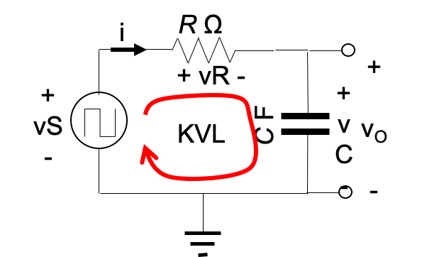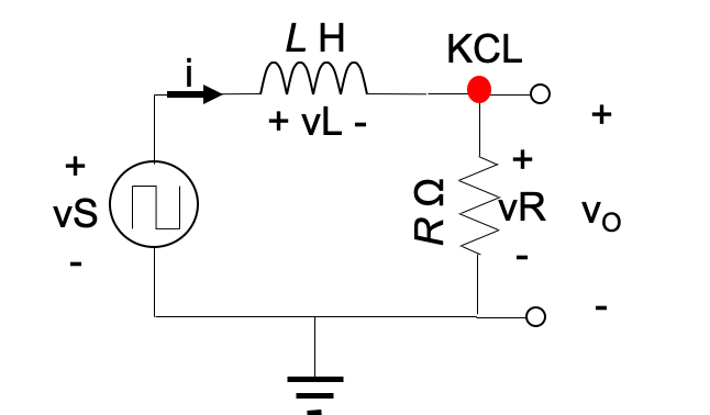 For the circuit shown below, provide an expression for the KCL at the node indicated, in terms of current (i), source voltage (vS), L and R.