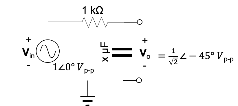... what must the angular frequency of the source (ω - in rad/s, accurate to 1%) such that the AC steady state output voltage (vO) has an amplitude of 1/sqrt(2) at a phase of -45o? (hint: i.e. |zC| = |zR|)