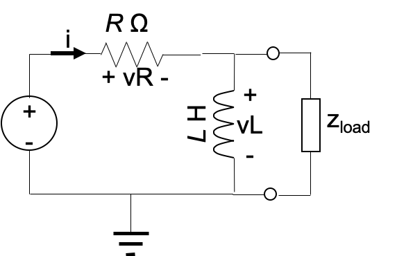 For the circuit shown below, where R = 0.34 kΩ, and L = 31.5 mH, and the source is sinusoidal with an angular frequency (ω) of 1 k rad/s: