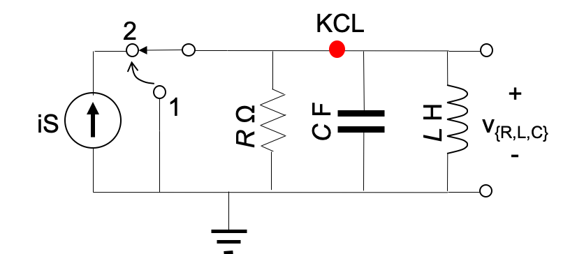 Write out the KCL indicated in this circuit, in terms of the voltage (v{R,L,C}), source current (iS), R, C and L, for t > 0.