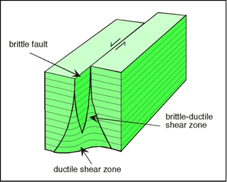 In the figure below, what statement best describes the changes in the nature of the fault/shear zone?
