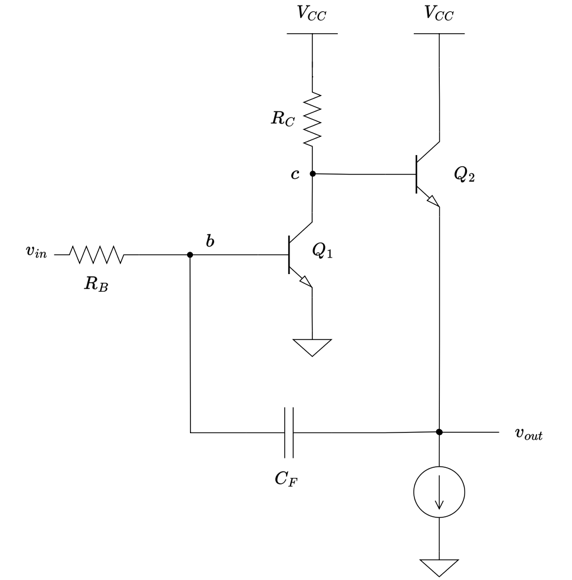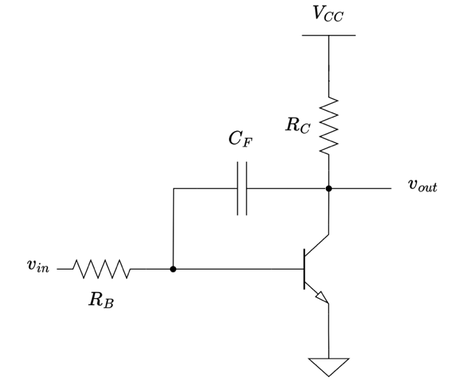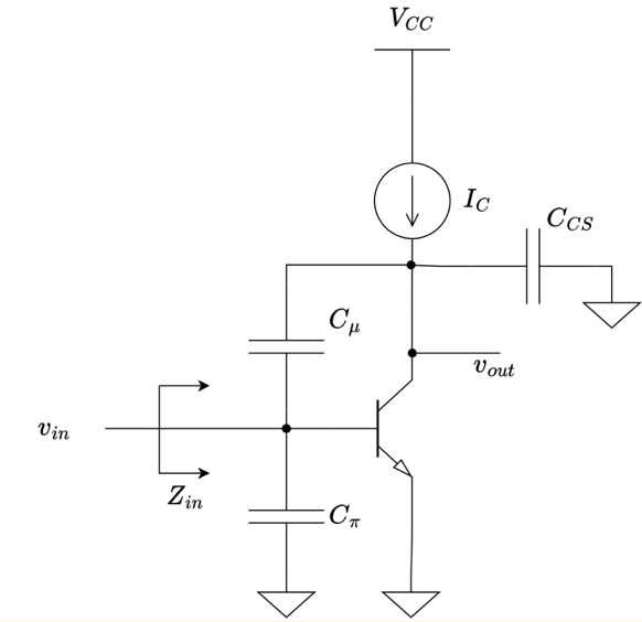 The BJT transistor circuit below is shown with its parasitic capacitance C_{\pi},