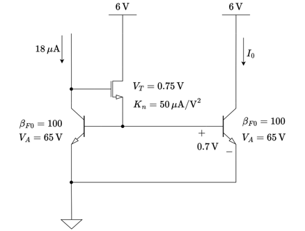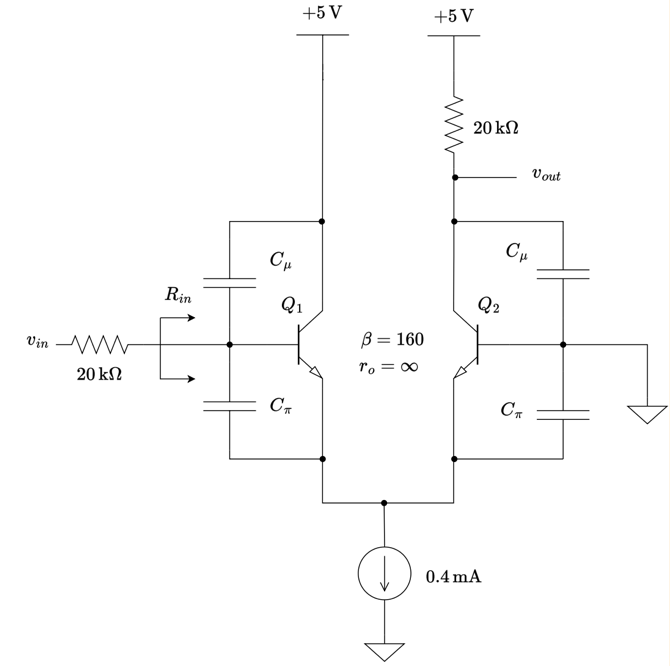 C_{\mu} + C_{\pi} = \frac{g_m}{2\pi f_T}. Assume that the 0.4mA current source provides 0.2mA current to each transistor at bias conditions.