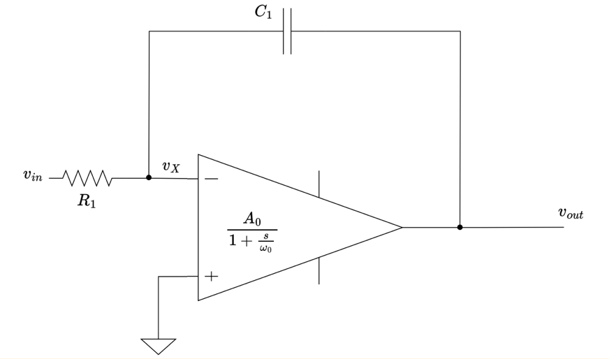 If the op-amp below has the following frequency response \frac{A_0}{(1+\frac{s}{\omega_0})} for its differential gain, determine the output waveform