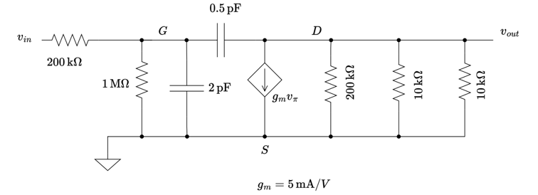For the circuit below, find the input pole (in rad/s) using Miller's theorem. Assume that