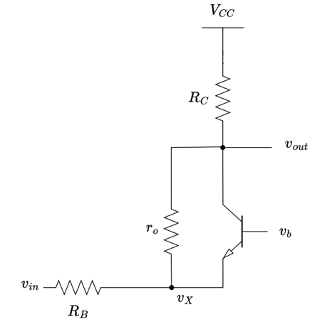 Consider the common-base amplifier shown below, where the output resistance r_o of the NPN BJT is drawn explicitly. Estimate the small signal gain