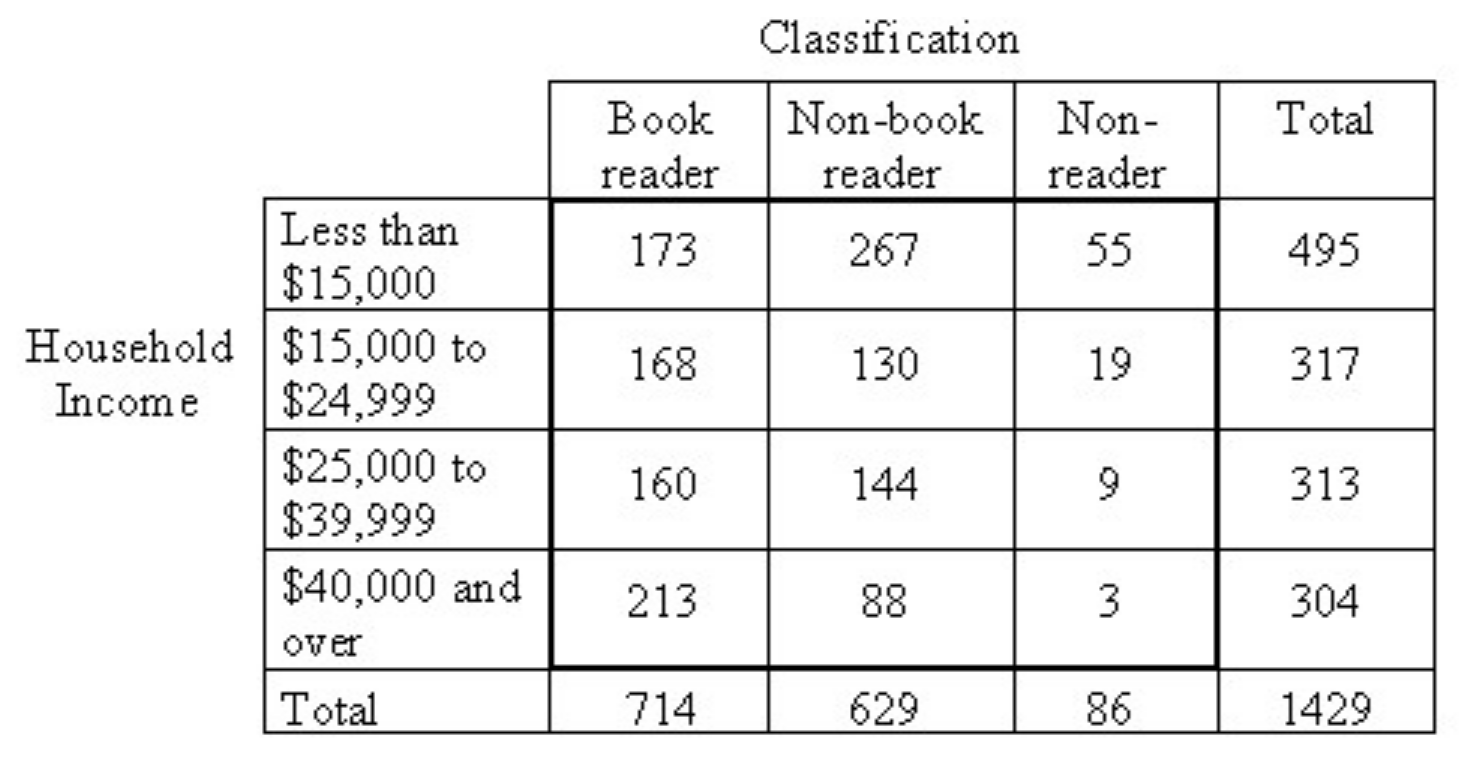 The Book Industry Study Group, Inc. performs sample surveys to obtain information on characteristics of book readers. A book reader is defined to be one who read one or more books in the six months prior to the survey; a non-book reader is defined to be one who read newspapers or magazines but no books in the six months prior to the survey; a nonreader is defined to be one who did not read a book, newspaper, or magazine in the six months prior to the survey. The following data were obtained from a random sample of 1429 persons 16 years old and over in an effort to determine whether or not the proportions of book readers, non-book readers, and non-readers are the same for each income bracket.