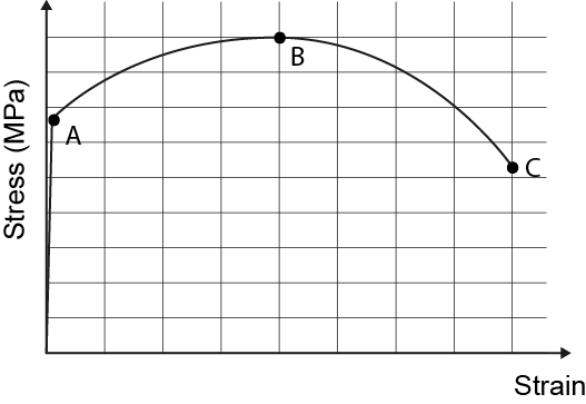 A material is tested in tension and found to have the following stress-strain graph. The coordinates of point B on the graph are (0.25, 56). The elastic modulus of the material is 7.8 GPa.