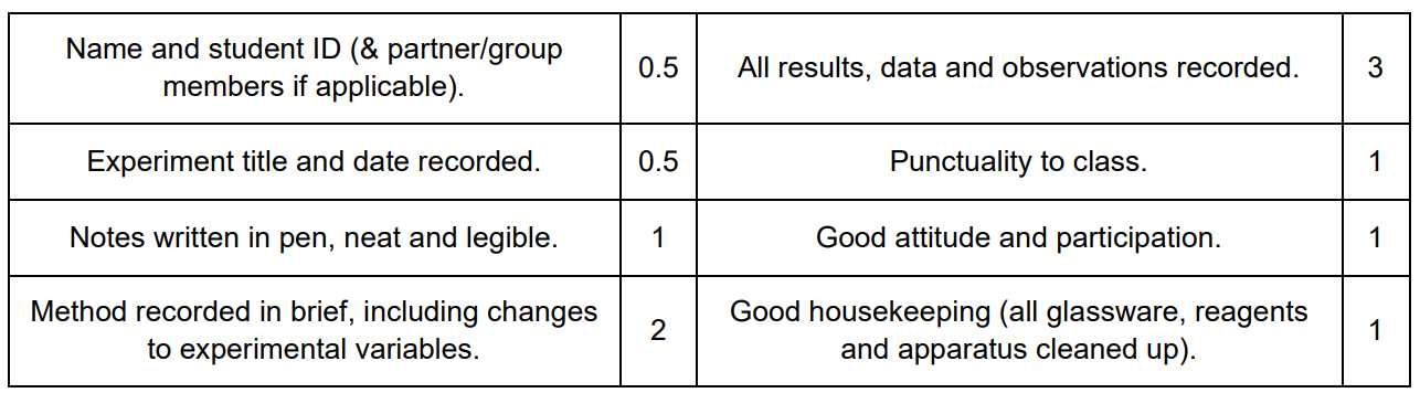 Discussion and interpretation of results. | No interpretation or comparison of results is made. No discussion points are addressed. | Some interpretation or comparison of results is made. Some discussion points are addressed. | Key findings are summarised. Results are interpreted. Results are compared to expected/predicted values. All discussion points are addressed. |