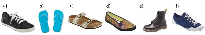 During your chemistry laboratory sessions it is compulsory to wear appropriate footwear. Using the figure below as a guide, select the items of footwear which are inappropriate for the chemistry laboratory.