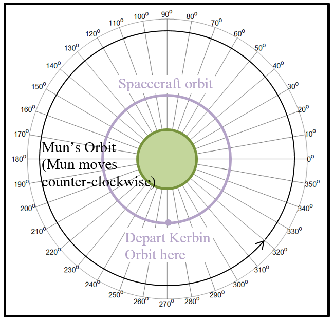 If we start our transfer orbit and depart for the Mun at the point indicated along the space craft orbit, where should the Mun be at this same time? I.e., What angle on the scale corresponds to the Mun's location when we depart?