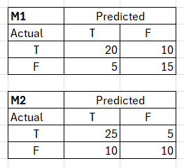 Study the two given confusion matrices (CM) given below. M1 is the CM for the KNN model and M2 is the CM for a Naive Bayes model. Both models are built using the same train-test datasets and are used for predicting loan default. Choose the correct option from the given alternatives.