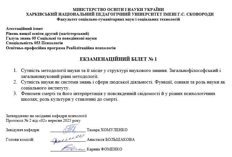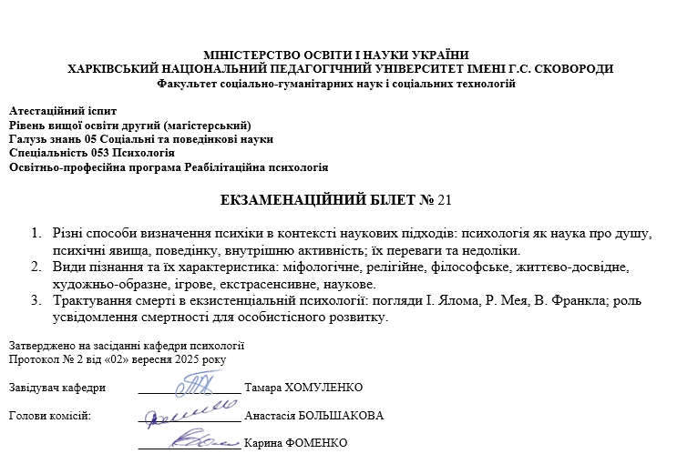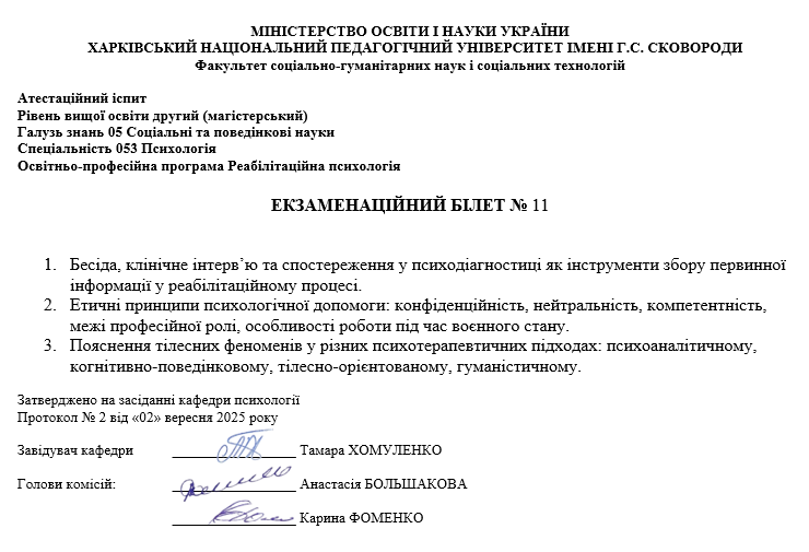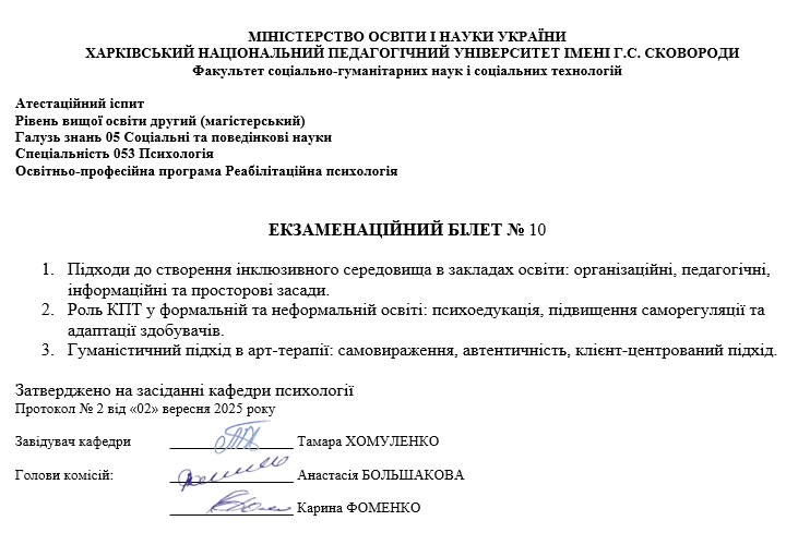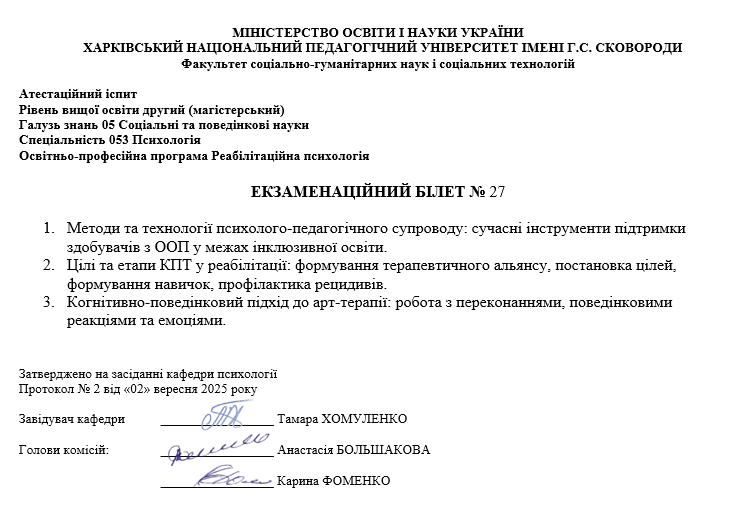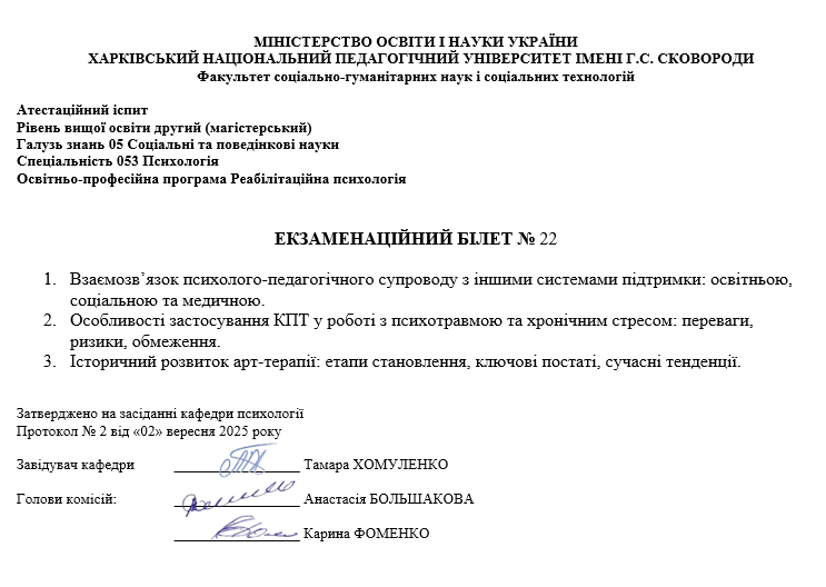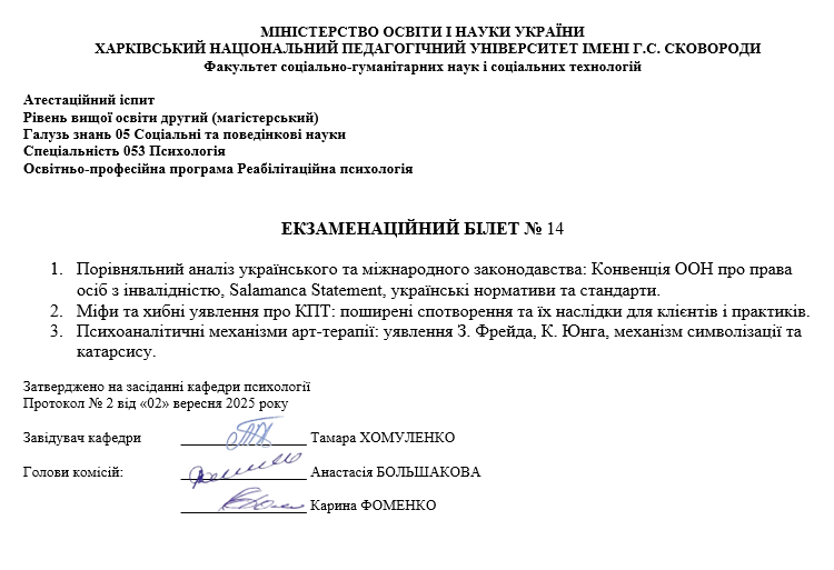 Атестаційний екзамен з психології, магістр ОП Реабілітаційна психологія (денна та заочна форма навчання) 2025