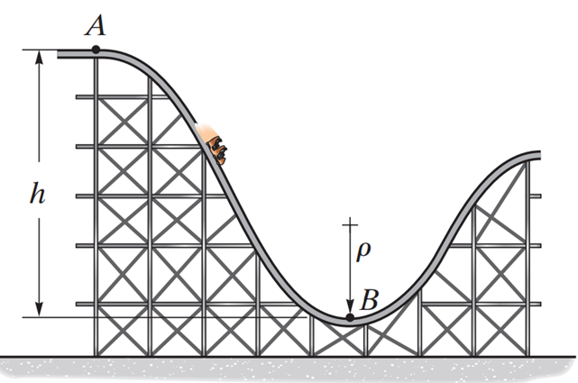 Determine the required height h of the roller coaster so that it will reach a speed of 100 km/h at the bottom B while starting from the resting position at the crest of hill A. Use g = 9.81 m/s2.