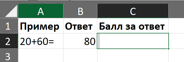 Какую формулу необходимо ввести в ячейку С2, чтобы при верном ответе (B2=80) программа указывала 1 балл за верный ответ, а за неверный - 0.
