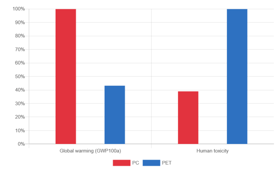Le premier résultat de comparaison entre le processus de production de bouteilles en PET et PC obtenu durant le TD correspondait à la figure ci-dessous. Quelles affirmations vous semblent vraies?