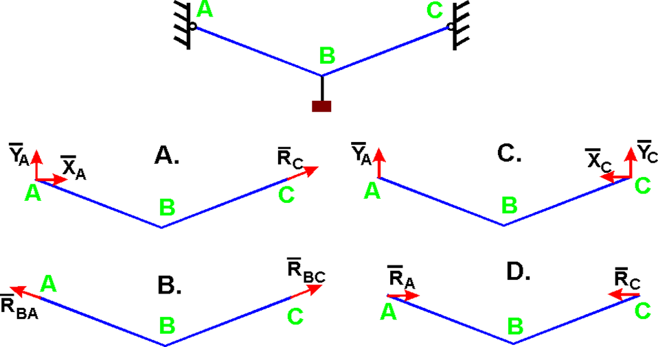 Укажіть напрямку реакцій зв'язків невагомих стрижнів AB і BC?