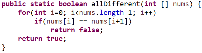 Se requiere un método que determine si todos los números de un arreglo son diferentes. Debe retornar true si todos los números son distintos; de lo contrario, debe retornar false. Alguien plantea la siguiente solución: