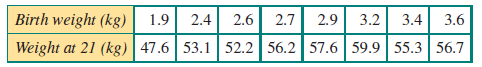 The birth weight and weight at age 21 of eight women are given in the table below.