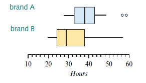 The parallel box plots shown display thedistribution of battery life (in hours) for twobrands of batteries (brand A and brand B).