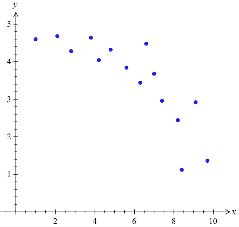 The association between two variables y and x, as shown in the scatterplot above, is non-linear. Which of the following transformations is most likely to linearise the relationship?