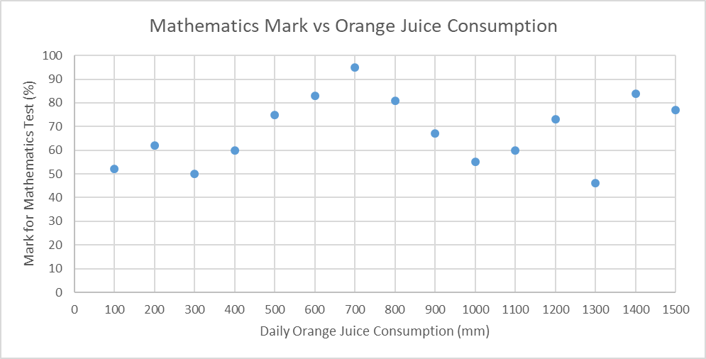 Clare has formulated the following hypothesis:Performance in mathematics tests will always improve whenever the amount of orange juice consumed daily increases.Claire then steadily increased her daily consumption of orange juice over a 15 day period during which she sat for 15 mathematics test.Claire recorded her daily orange juice consumption and her performance on the mathematics test and constructed the data visualisation show below based on the data she collected.