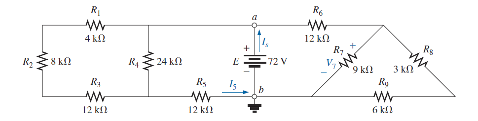 Para el siguiente circuito, calcule el voltaje en la R9 (V9), en Volts.