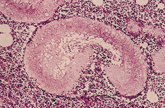 La siguiente imagen corresponde a la observación con Hematoxilina & Eosina, de una muestra obtenida de una lesión granulomatosa, fistulosa en una pierna. De acuerdo a los filamentos que lo forman ¿Qué observa?: