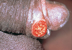 Paciente de 30 años que acudió al médico por presentar la lesión que se observa en la imagen. No le duele y en general no tiene molestias. Refiere que 15 días antes estuvo en Puerto Barrios y tuvo relaciones con señoritas de la vida galante. ¿Cuál es la posible patología?