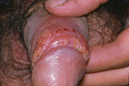 Paciente de 35 años que acude al Centro de Salud por presentar las lesiones que se observan en la imagen. Refiere que tiene 15 días de tenerlas, le duelen mucho y en el examen físico se pudo observar la presencia de adenopatía inguinal dolorosa. Indica que 3 semanas antes tuvo contacto con una persona de dudosa reputación. ¿Cuál es el posible diagnóstico