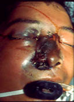 Paciente diabético no controlado que inició con secreción obscura en la fosa nasal derecha 5 días antes de acudir al hospital. Un análisis microbiológico reveló micelio hialino, grueso, bifurcado y cenocítico. Una semana después el paciente entró en coma y falleció. ¿Cuál es la posible patología?