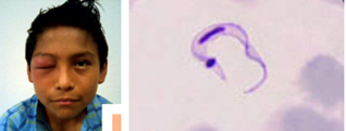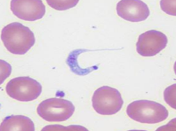 Un paciente de 45 años, originario de México, se presentó con fiebre y escalofríos aproximadamente un mes después de haber recibido un trasplante de corazón. Se realizó una biopsia cardíaca y se recolectaron muestras de sangre. El patólogo tratante observó objetos de interés en un frotis periférico teñido con Wright. Se encontró lo siguiente.