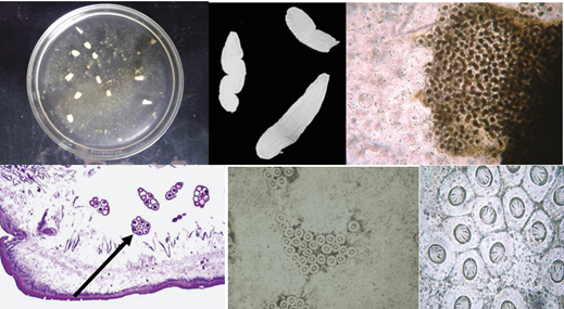 Mujer de 40 años Guayaquil, Ecuador Incomodidad y dolor en el hipocondrio derecho con masa palpable, ictericia y fiebre de varios días de evolución. Duerme y besa a sus perros y que no los ha desparasitado en muchos meses. Se le realizó una TAC que se muestra a continuación. Nombre del parásito causante de esta patología y forma evolutiva infectante: