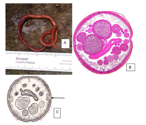 Un hombre de 31 años, originalmente de Ecuador, vomitó lo que parecía un gusano largo. Presentó dolor abdominal de 5 días de evolución. El objeto (Figura ) medía 27 centímetros de largo. El objeto fue enviado a un laboratorio de patología y le realizaron cortes transversales. Los cuales observan a continuación. ¿Cuál es la forma evolutiva que se debe ingerir para infectarse por este parásito?