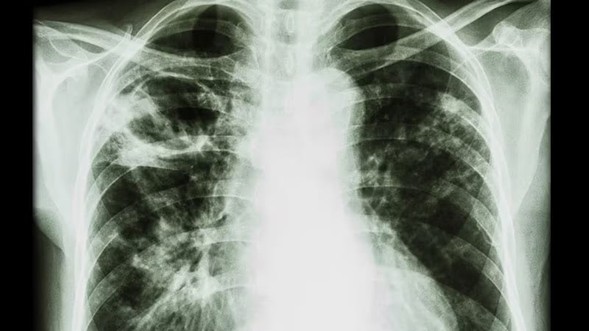 Paciente masculino de 23 años quien es llevado a consulta por productiva, malestar general fatiga y disnea. Menciona además que últimamente ha tenido que utilizar más veces al día su tratamiento de rescate para asma. Entre los antecedentes menciona que cree que la Pachamama es perfecta, así que se come todas las verduras tal cual las recoge de la siembra sin lavarla ni hervirla. Además, menciona tener malestar abdominal, dolores tipo cólico, náuseas, meteorismo, vómitos ocasionales y diarrea. Se le realiza un examen de heces que menciona que tiene "huevos" y una biopsia pulmonar que verán a continuación... Con base a toda la información... ¿Cuál de las siguientes radiografías torácicas es más probable que tenga este paciente?