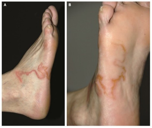 Hombre de 42 años se presentó con una erupción intensamente pruriginosa en el pie derecho, de un mes de evolución, después de unas vacaciones en Nigeria. La erupción era migratoria, desplazándose de unos milímetros a unos centímetros por día. El examen físico reveló un trayecto serpiginoso, eritematoso y elevado en el pie derecho (figuras A y B). ¿Qué parásito produce esta patología?