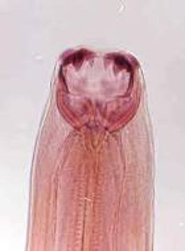 El nemátodo fue encontrado en las paredes del intestino delgado en un paciente al que se le realizó cirugía por otro motivo. La cápsula bucal tiene 2 pares de dientes.
