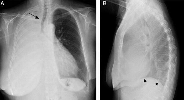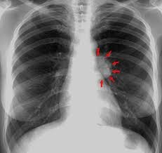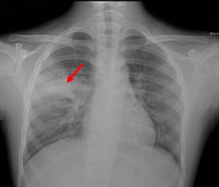 Paciente masculino de 23 años quien es llevado a consulta por productiva, malestar general fatiga y disnea. Menciona además que últimamente ha tenido que utilizar más veces al día su tratamiento de rescate para asma. Entre los antecedentes menciona que cree que la Pachamama es perfecta, así que se come todas las verduras tal cual las recoge de la siembra sin lavarla ni hervirla. Además, menciona tener malestar abdominal, dolores tipo cólico, náuseas, meteorismo, vómitos ocasionales y diarrea. Se le realiza un examen de heces que menciona que tiene "huevos" y una biopsia pulmonar que verán a continuación... Con base a toda la información... ¿Cuál de las siguientes radiografías torácicas es más probable que tenga este paciente?