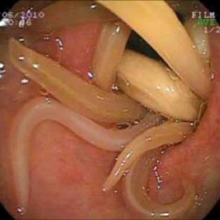 Paciente femenina de 4 años quien es llevada de emergencia al hospital por dolor abdominal difuso. Al examen físico se encuentra una infante con la circunferencia abdominal aumentada, sin ruidos peristálticos, dolor a la palpación, timpanismo aumentado y sensación de masa a nivel intestinal. Se decide realizar una endoscopía que demuestra lo de la siguiente fotografía: